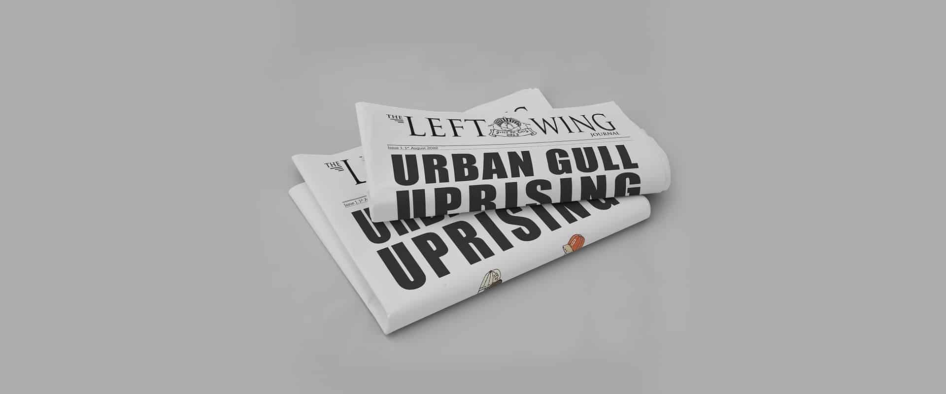 The Left-Wing Journal is an agit-prop newspaper created by the gulls as part of their campaign to educate and challenge the negative views many humans have of gulls. The gulls seek to share alternative views to the mainstream human media, one that creates common cause with humans in a struggle against capitalism to save the planet for both humans and animals alike. The paper also carried articles from their fellow human allies including Birwd Watch Ireland and Jess Spears paleoceanographer among others. Other artworks include fictional photographic and text artifacts from the gulls uprising. The project is toured port town in Wales and Ireland.