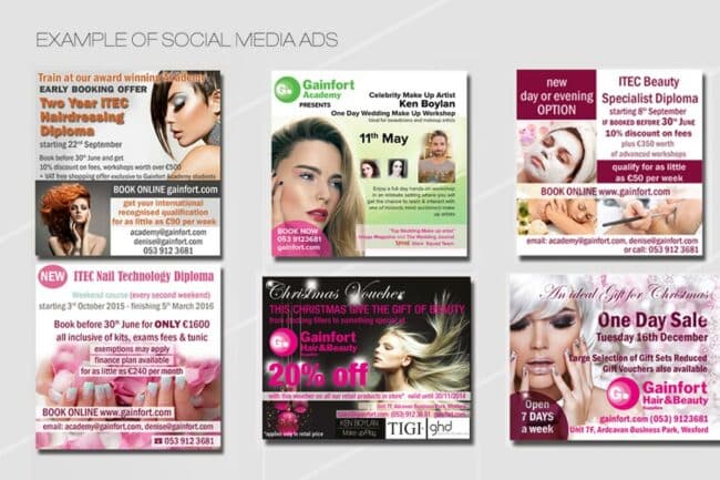 Our Graphic Designer worked closely with Gainfort Beauty Academy in Wexford to produce a new range of promotional materials, taking the academy’s existing branding and utilising skills like innovative page layout, fresh colours and print publishing know-how. The result was a beautiful selection of flyers, brochures, magazine advertisements, pull-up banners to mention but a few! Click through the gallery for samples.